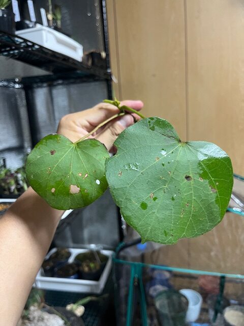 枝をカットしたら乾燥させてから発根促進剤に浸けるやり方をよく見ますが、ビザプラ研究室ではカットしたらそのまま突っ込みます。